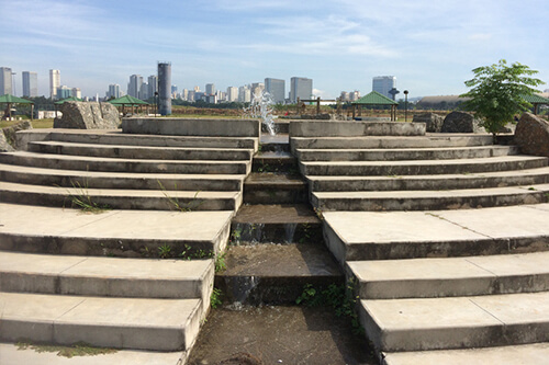 Um espaço elevado com arquibancadas de concreto voltadas para a área esportiva do parque.